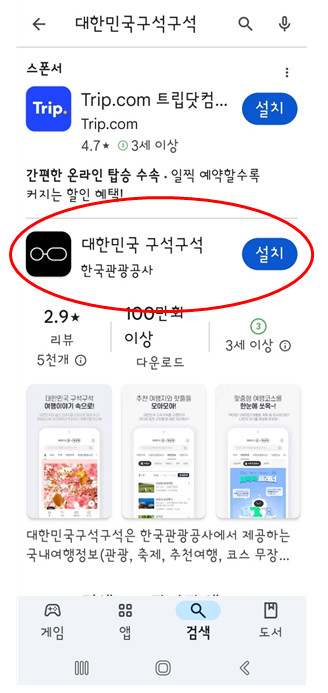 1. 플레이스토어나 원스토어 등에서 '대한민국 구석구석'을 검색하여 다운로드합니다.