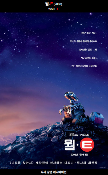 픽사의 대표적인 작품 중에 빠져서는 안 되는 작품으로 월 E가 있습니다. 머나먼 미래의 로봇 이야기지만 현재의 우리에게도 따뜻한 감동을 주는 귀엽고 작은 로봇의 스토리입니다.