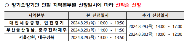 대전세종충청 / 인천경기본부는 오전 10시, 부산울산경남 / 광주전라제주본부는 11시, 서울강원 / 대구경북본부는 13시에 접수를 시작합니다. 각각 50분씩의 접수시간 안에 접수하셔야 하며, 추가신청 기간은 별도로 공지되어 있습니다.