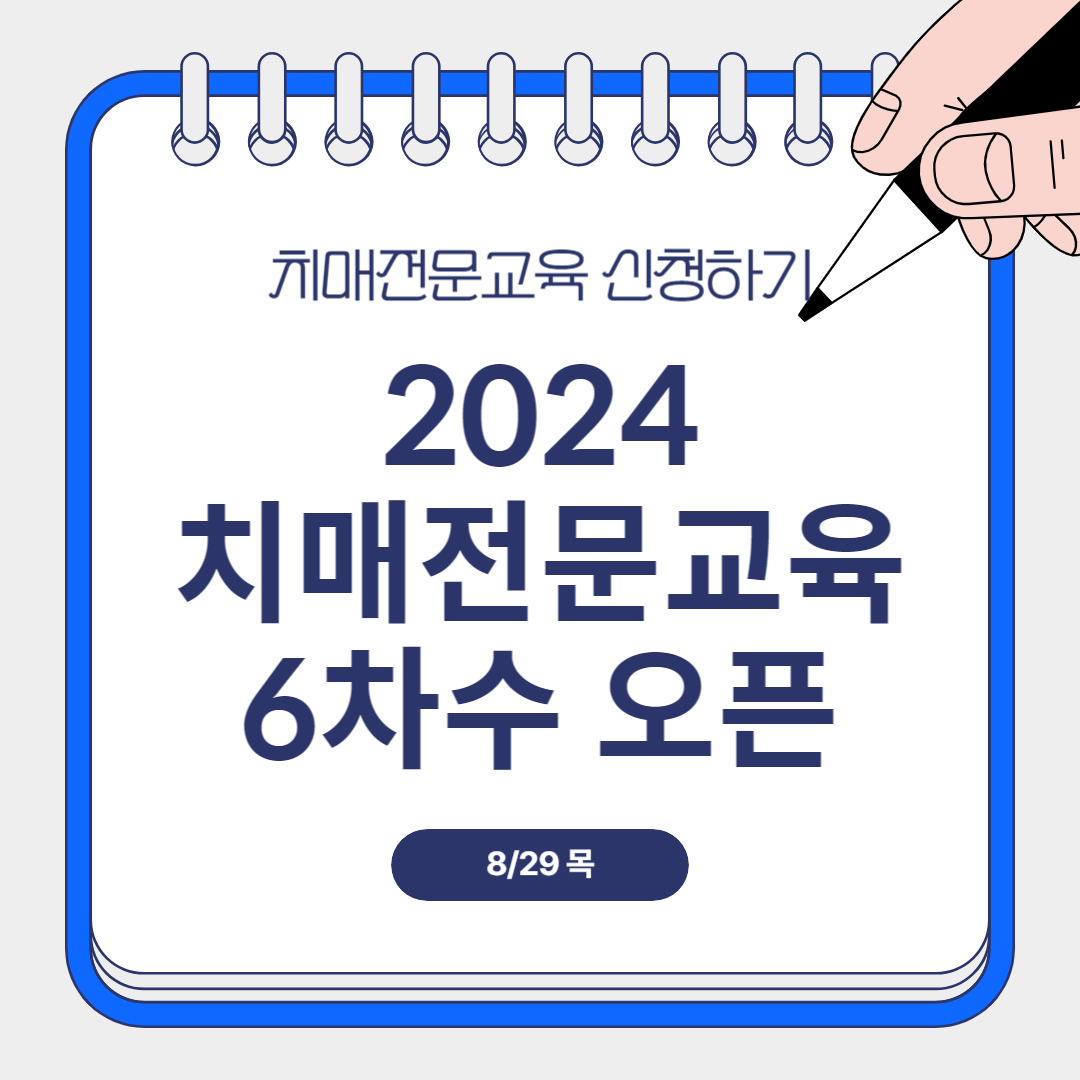 치매전문교육 6차수 교육일정이 오픈되었습니다. 6차수 접수일은 8월 29일 하루입니다. 공고 내용을 잘 확인하시고 접수하세요.^^